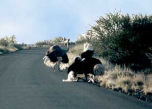 | L'autruche (Struthio camelus) détient plusieurs records : c'est le plus grand oiseau ; elle court plus vite que tout animal à deux pattes, et pond les oeufs les plus gros du monde. L'autruche est la seule parmi les oiseaux à posséder deux doigts à chaque pied, qui lui permettent de s'enfuir d'un pas de course. Dotée de muscles puissants, elle marche à 4 km/h. Inquiétée ou en parade, elle monte à 30 km/h. Effrayée, l'autruche peut atteindre 70 km/h. |