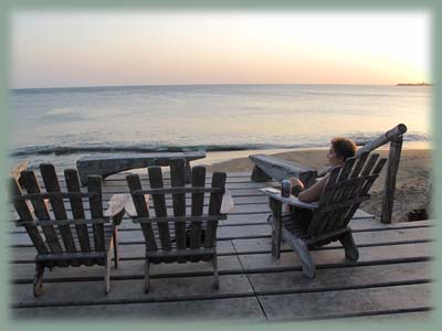 Une fois de plus, la vie et la chaîne de l'amitié nous font un beau cadeau : notre première halte sera en effet dans la province de Los Santos, chez un ami de Bruno (qui nous suit sur Internet). Cet ami, Philippe, est un français qui vit depuis plus de trente ans au Panama, et est propriétaire d'un superbe hôtel en bord du Pacifique, sur la plage "los Destiladeros" non loin de Pedasi. Philippe nous accueille royalement et met une chambre à notre disposition dans cet environnement luxueux. C'est ainsi que pendant 24 heures, nous faisons une pause balnéaire, partagée entre la baignade dans l'océan (27° en moyenne), la piscine, et la sieste. Le soir, Philippe nous invite à partager avec lui un dîner préparé par le Chef de l'hôtel, avec langouste et poisson, le tout arrosé d'un bon vin blanc… français. Un merveilleux cadeau d'anniversaire ! Philippe est un personnage hors du commun, qui mérite d'être connu, et sa gentillesse à notre égard nous touche réellement. |