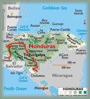 Mercredi 10 mars 2010 : nous quittons donc le Nicaragua pour continuer notre progression vers le nord, et entrer au Honduras. Le passage de la frontière, à Somotillo et non sur la Panaméricaine, se fait dans d'excellentes conditions, en à peine plus de trois quart d'heure, du bonheur ! L'accueil des honduriens va au-delà de nos espérances, la femme officier de douane allant jusqu'à nous donner l'argent (nous n'avions pas encore de lempiras, monnaie locale) pour faire les 6 photocopies de nos documents dont elle a besoin. Le Honduras est bordé au sud par le Nicaragua, et au nord par le Guatemala et par le Salvador. Le conquistador espagnol Hernan Cortes arriva en 1524. Les Espagnols essayèrent de réduire les Indiens en esclavage. Certaines tribus et peuples résistèrent. Parmi ces rebelles à l'invasion se trouvait Lempira, chef des Lencas, un peuple indigène. C'est aujourd'hui un héros national et la monnaie du pays porte son nom en son hommage. En 1821, le Honduras proclama son indépendance. |
