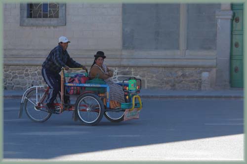 Pour la nuit, la police locale nous offre de rester dans la cour, fermée, du commissariat. Le lendemain, nous passons plusieurs heures à visiter ce ravissant village aux maisons en pisé peintes en rose. Ce qui nous frappe dans tous ces villages andins, c'est le mode de transport local : le taxi est remplacé par des pousse-pousse, tricycles et triporteurs, dont certains sont même sonorisés. Nous prenons ensuite la route d'Arequipa, avec un col à 4.600 m, et encore de beaux paysages andins. |