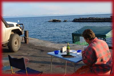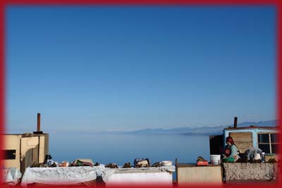 C’est une journée de transition, après ces 3 semaines de route à un rythme soutenu : courses, cyber café (super connexion Internet, ADSL haut débit, plus rapide que chez nous !), et entretien du 4x4 chez le concessionnaire Toyota d’Irkoutsk, où nous pique niquons dans la "guest room " Nous faisons ensuite une partie du tour du Baïkal, superbe dans sa robe enneigée. |