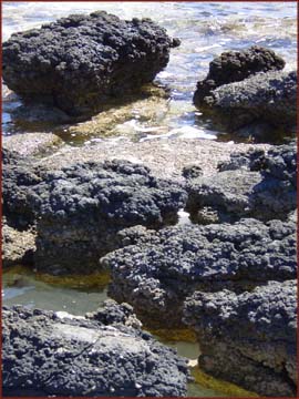 La Shark Bay est seul endroit au monde où les stromatolites ou stromatolithes continuent à croître. Les sédimentologues considèrent que cette baie est un lieu saint : les constructions dues aux algues, ou stromatolites, ont une taille et une diversité morphologique analogues à celles de leurs lointains ancêtres, pendant leur âge d'or, au Précambrien (3.5 milliard d'années). Découvertes à la fin des années 1950, les stromatolites de la Shark Bay s'élèvent dans la zone intertidale (zone de marée), le long d'un lagon intérieur appelé Hamelin Pool. Ils doivent leur prospérité à la forte salinité deux fois la salinité des océans qui éloigne les brouteurs d'algues, tels les chitons et les escargots, et à la très forte évaporation de l'eau dûe à la faible profondeur. Les stromatolites sont des structures solides en forme de choux-fleurs créées par une association microbienne. La partie éclairée du sommet est constituée d'une couche mince et gluante, formée de cyanobactéries (algues bleues) qui, par photosynthèse, produisent de l'oxygène, alors que des microbes, dont l'existence dépend de la fermentation, survivent dans les replis sombres sous cette couche. |