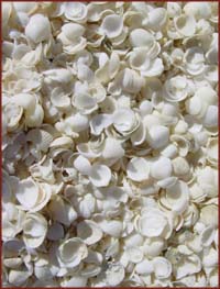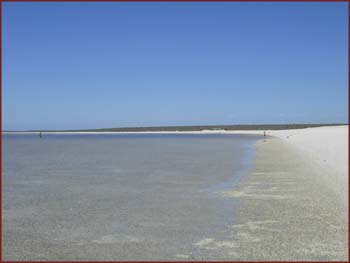 La Shell Beach (plage aux coquillages) est longue de 60 km et recouverte de minuscule coquillages (11 mm) empilés sur une épaisseur de 5 à 10 m. Cette extraordinaire accumulation, dont la plupart sont des "Fragum erugatum" (un bivalve), serait dûe à une hyper salinité des eaux marine (60%) de la Shark Bay, à un court cycle de reproduction (un an), et aux cyclones qui sévissent depuis plus de 5.000 ans sur la région. On ne trouve pas encore un grain de sable, pour cela il faudra attendre quelques milliers d'années. |