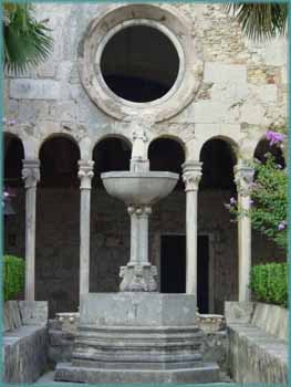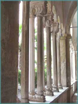 ![]() Superbe ouvrage de style roman tardif, le cloître se compose de colonnes géminées dont le chapitaux, tous différents, adoptent la formes de têtes humaines et d'animaux ou s'ornent de motifs floraux. |