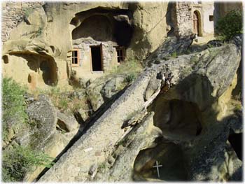Dans ce "désert" du Gareja, les douze monastères troglodytes sont aujourd'hui, pour certains, à nouveau habités par des moines et des popes depuis l'indépendance de la Géorgie en 1991 . Mais ils furent désertés à plusieurs reprises à cause de plusieurs invasions : Seldjoukide (Turquie), Mongol et Perse. |