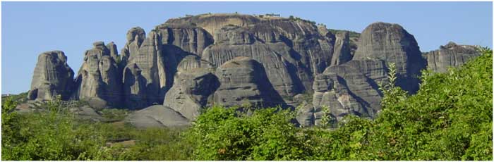 | Au sommet de ces monts célestes, des moines s'étaient installés dès le XIe siècle, cherchant la solitude sur ces éminences rocheuses, mais qui les rapprochaient aussi de Dieu. La plupart de ces "Meteorisa monastiria" (monastères suspendus) sont aujourd'hui en ruine. Seuls six d'entre eux subsistent, dont trois habités, et sont encore ouverts aux visiteurs. Les moines ont peu à peu formé une importante communauté d'ermites, et, entre le XIVème et le XVIème siècle, 26 monastères ont été construits, surplombant ainsi la vallée du Pinde. On ne sait pas exactement quand les Météores ont été habités pour la première fois, en effet toutes les sources écrites qui existent datent uniquement de l'ère monastique. Ces sont des monastères dit cénobitiques, c'est à dire que tout est mis en commun : l'argent, les vêtements, le travail, la prière ; l'autorité suprême est assurée par un conseil guidé par un Higoumène (supérieur spirituel d'un monastère orthodoxe). |