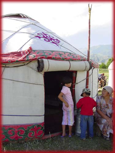 | Les yourtes kirghizes sont les plus belles à mon goût. Il existe différents types de yourtes : la yourte de maître, la plus grande, de couleur blanche ; la yourte daccueil pour les hôtes, souvent la mieux équipée ; la yourte-cuisine, domaine des femmes. Il convient dajouter à cette liste la yourte funéraire particulièrement ornée où tout kirghize qui vient de décéder est déposé, même en ville, "afin de reprendre contact avec ses ancêtres". |