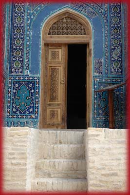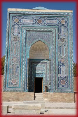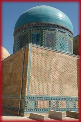 | Les coupoles du mausolée Qazi Zadeh Roumi (1420-1425), le plus grand de l'ensemble, est dédié à Ulugh Beg, le petit-fils de Tamerlan. Ces superbes constructions aux différentes techniques décoratives sont autant de styles architecturaux allant du XI au XVème siècle, une véritable apothéose de l'art de la céramique. C'est à Samarcande que Qazi Zadeh Roumi (fils du juge anatolien en persan) rencontra en 1410 Ulugh Beg, dont il devint le professeur et chez qui il développa le goût des sciences. |