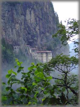 | Le monastère grec orthodoxe de Sumela se trouve dans l'arrière pays dans le parc national d'Altyndere. C'est dans ce site exceptionnel et suspendu à la paroi d'un éperon rocheux de 1200m, qu'il surplombe une gorge profonde. En parti taillé dans la roche et dédié à la Vierge Marie, ce sanctuaire de l'époque byzantine se trouve à 50 km de la mer dans la région de Trabzon. Il comprend une église aménagée dans une grotte et une chapelle ornée de belles fresques, et divers bâtiments dont certains ont été rajoutés au XVIIème siècle. Pour le visiter on y accède par un chemin qui monte dans la forêt, les moines l'ont occupé jusqu'en 1923. |