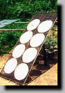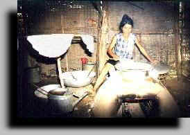Fabrique artisanale de ce qui servira à envelopper les nems, rouleaux de printemps etc... La femme, sur une plaque chauffée grâce à un four à bois, étale la farine de riz allongée d'eau et à la manière d'une crêpe, la fait cuire quelques secondes, puis elles sont étalées au soleil pour sécher. Réhydratés et alors souples, ils seront fourrés de toutes sortes d'ingrédients... Déliceux ! |